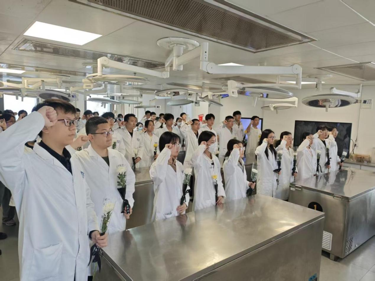 4月3日,学院在趵突泉校区举行“礼赞无言良师”活动,旨在缅怀与致敬大体老师的无私奉献,弘扬生命至上、大爱无疆的崇高精神,同时涵养医学生敬畏生命、笃行医者使命的职业情怀。学院党委副书记姜昆,本科生党支部书记陶书佳,团委负责人赵景琳,解剖学与神经生物学系教师代表李振中、温明新以及2025级本硕学生代表90人参加活动。